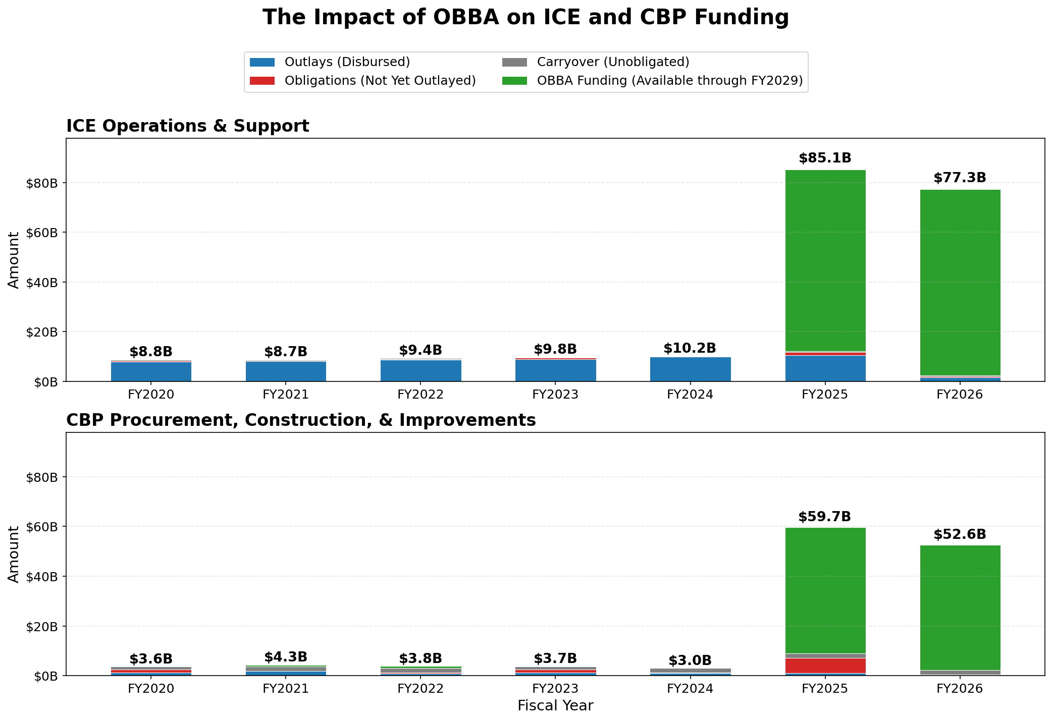 Separate from the annual appropriations cycle, Congress enacted OBBA in July 2025, which appropriated $140 billion to ICE and CBP. Unlike annual appropriations, this funding is available for four years (through September 30, 2029) and is not subject to the limitations included in the agencies’ annual appropriation.