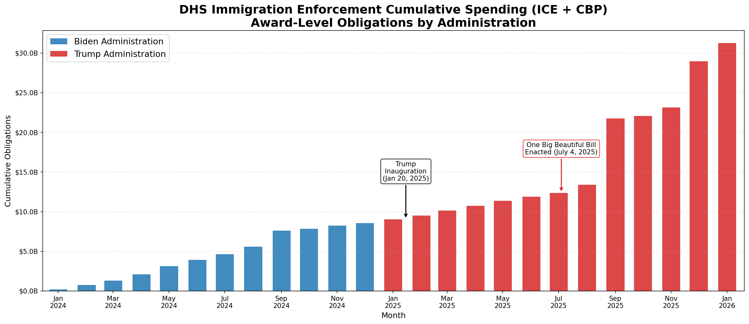 Figure 2 shows ICE and CBP’s combined third-party contract obligations from January 2024 through January 2026. These obligations represent formal financial commitments that the agencies agreed to, not the amount of funds that have been disbursed. OBBA’s impact is immediate. Since the law passed last July, ICE and CBP have obligated $19.2 billion—2.25 times what they obligated in calendar year 2024.