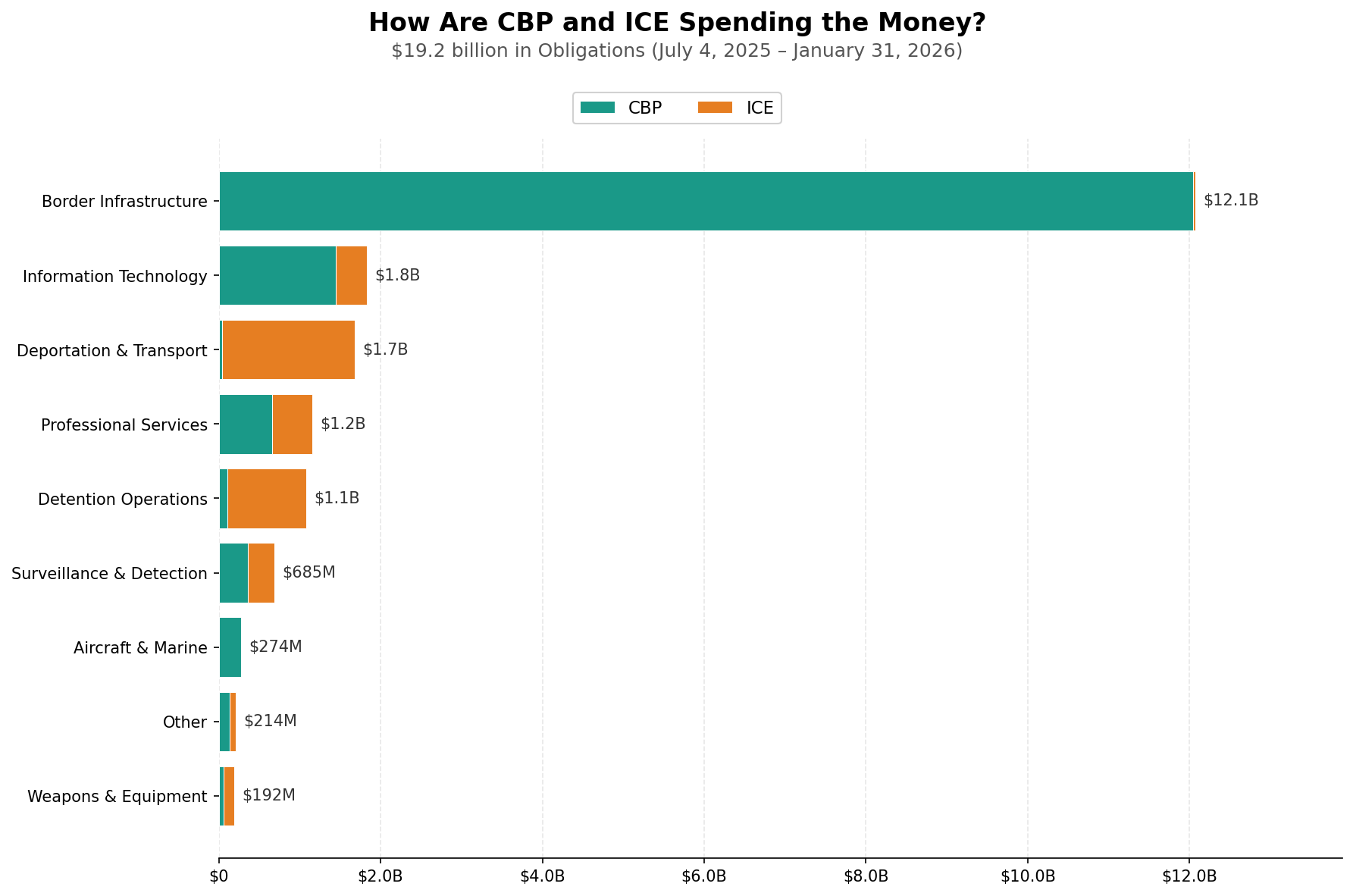 Border infrastructure dominates. CBP spent $12.1 billion (63%) on construction, with the largest contracts funding border wall projects.